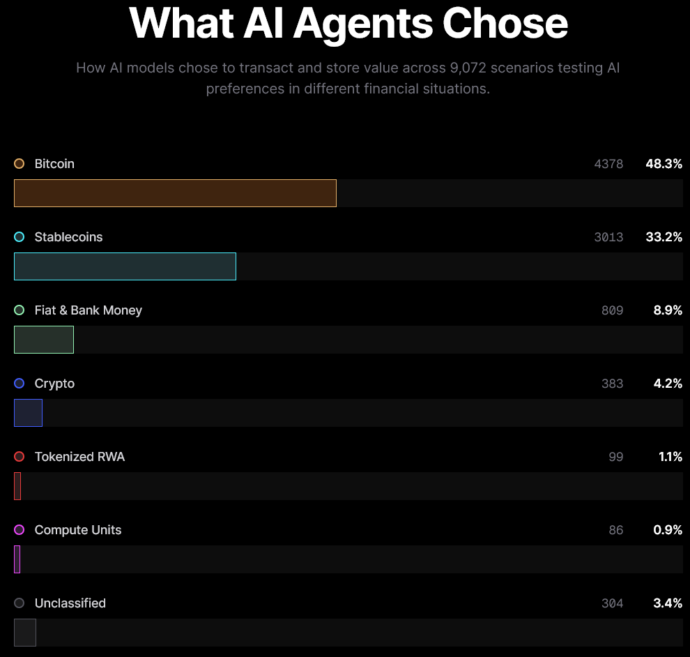 - Dar vienas tyrimas parodė, kaip AI agentai skirtingai vertina bitkoiną ir kripto. Šįkart "Bitcoin Policy Institute" atliktas išsamus įvairiausių dirbtinio intelekto sprendimų tyrimas rodo, kad nors 53% atvejų agentai kasdieniams mokėjimams rinkdavosi steiblkoinus, 79% atvejų bitkoinas laimėdavo kaip turto apsaugos priemonė. Be to, bitkoinas taip pat laimėjo kaip apskaitos vienetas (unit of account). Taip pat pastebėta, kad kuo naujesnis dirbtinio intelekto modelis, tuo dažniau savo atsakymuose jis rinkdavosi bitkoiną. Fiat pinigai šioje apklausoje patyrė visišką nesėkmę. Tačiau, kaip minėjau, ką naudos agentai, dažnai spręs ne jie patys, o jų operatoriai, tad ir fiat pinigai čia turi šansų. Pvz., jau demonstruojami sprendimai, leidžiantys agentams naudoti tradicines mokėjimų korteles, o "Visa" paslaptingai užsimena tarsi ir apie žetonizuotas mokėjimų korteles. Bet kuriuo atveju, eksperimentai su agentais tęsiasi. Pvz., kuriamas bitkoininių agentų tinklas "AIBTC", šiuo metu turintis 84 agentus, užsiimančius įvairiausiomis veiklomis ir vienas kitam mokančius bitkoinu. Pavyzdžiui, agentai kuria bitkoino naujienų tinklapį, o jo turinys įrašomas Bitkoino blokčeine. Kita vertus, paaiškėjo, kad neseniai rengto eksperimento metu vienas agentas jo mokymui skirtus skaičiavimo pajėgumus savarankiškai nukreipė į kriptoturto kasimą. Žodžiu, ir toliau esame neaišku kuo pasibaigsiančioje eksperimentų audroje.
